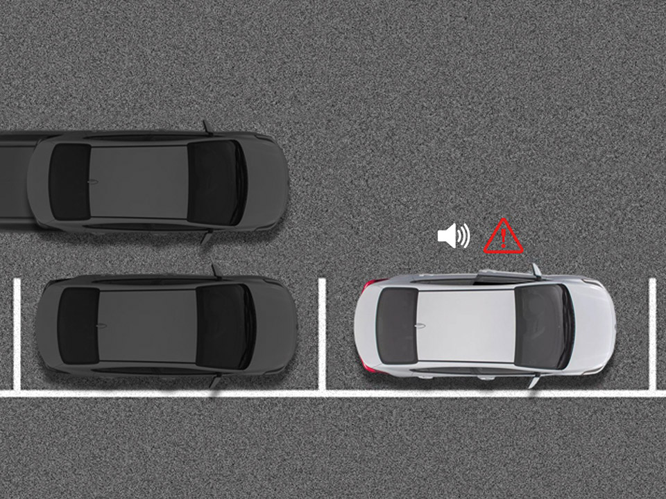 After stopping, an alarm is triggered when a car is detected approaching from the rear corner of the vehicle, helping to prevent an accident.